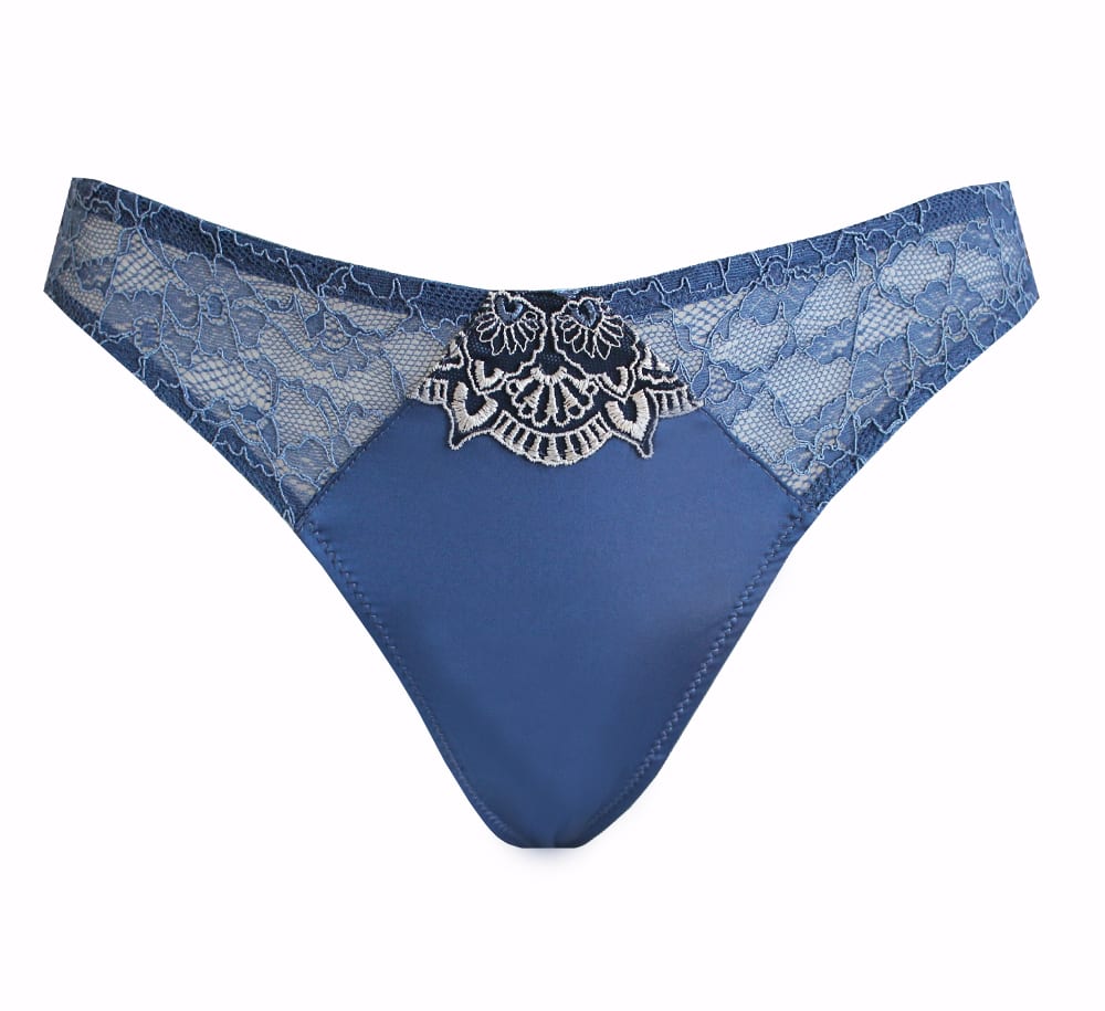 Made of smoky blue satin and lace, the Aphrodite thong is a classic hipster fit making it practical under any outfit.