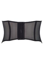 An intriguing, richly embroidered semi-corset in a pattern of black lace on beige, a feminine lace up front and a hook and eye fastening to the back. Nicely emphasizing the waistline and the roundness of the hips, perfect when matched with the bra, string and a pair of stocking, also available separately on the website.